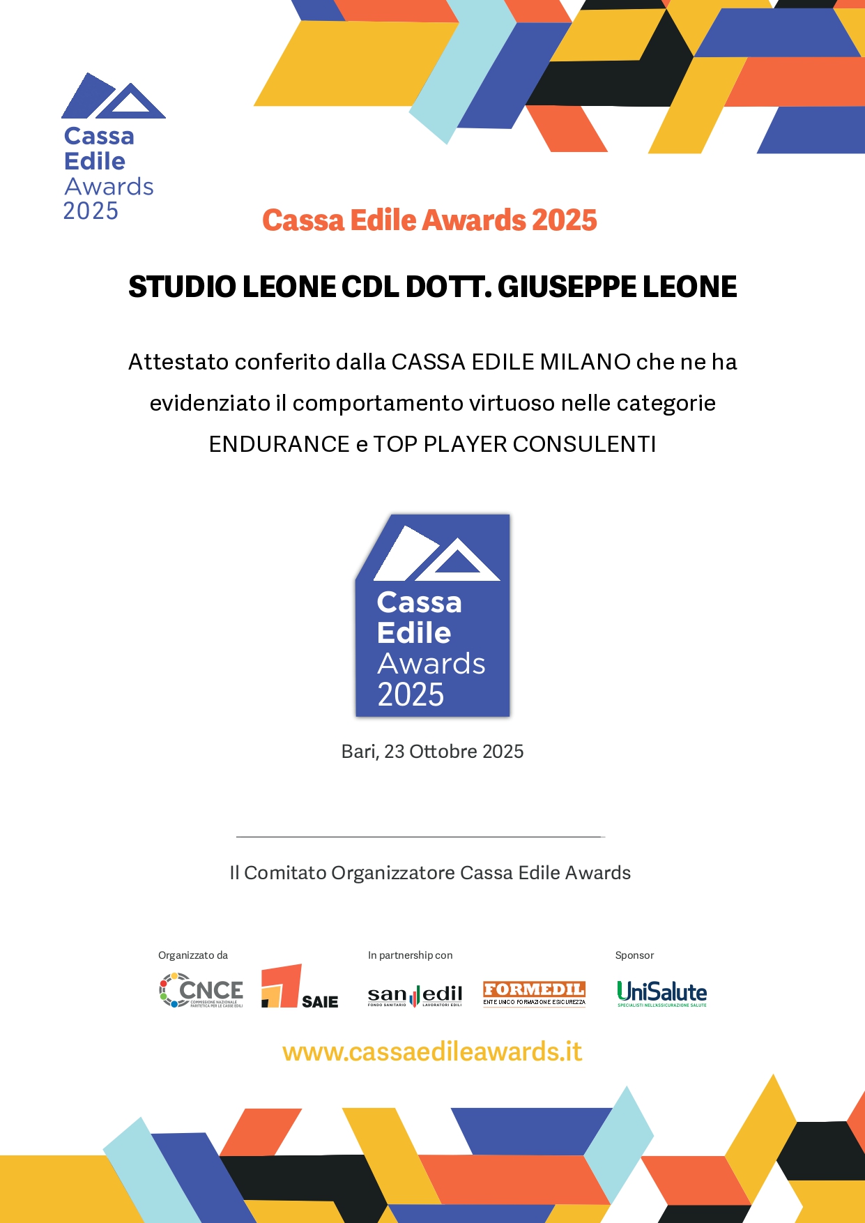 Il nostro studio è orgoglioso di annunciare di essere stato premiato con il prestigioso Bollino Cassa Edile Awards 2025. Questo riconoscimento, conferito dalla CASSA EDILE MILANO, sottolinea il nostro impegno e il nostro comportamento virtuoso nel settore. Siamo costantemente dedicati a rispettare le regole e i contratti collettivi nazionali, ponendo particolare attenzione nel contrastare la concorrenza sleale.
